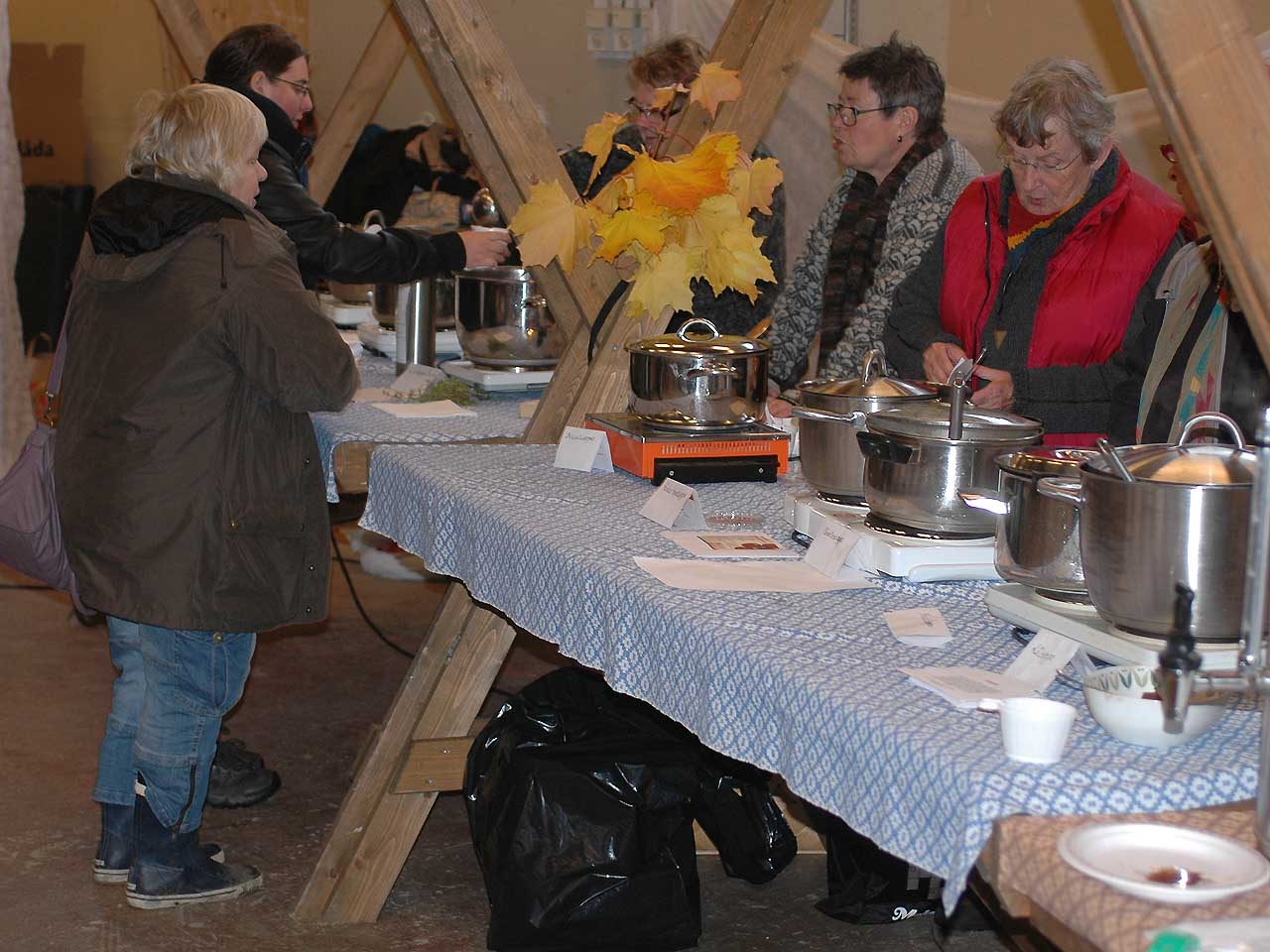 Här startar lyckan att få provsmaka alla dessa soppor! Man betalar bara för en mugg. För en blygsam penning av 50kr så får man smaka på alla dessa fantastiska soppor; kålsoppa, broccolisoppa, tomatsoppa, purjolökssoppa, gyllengul linssoppa, rödbetssoppa, potatis och purjolökssoppa, killingssoppa och morotssoppa m.fl..