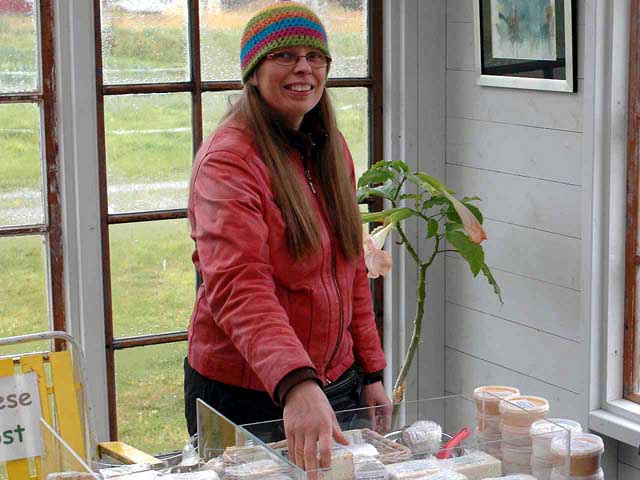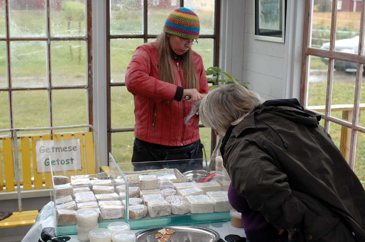 Tove Graeffe från Meåfors Getgård, med sin fantastiska ost. Katarina är salig! Hon köper alltid den mest lagrade, starkaste. Foto från Roger och Susanne Johanssons nybyggda gårdsbutik, med gamla fina dörrar och fönster från Bollstabruk herrgård, n.v. LRF kontor.
