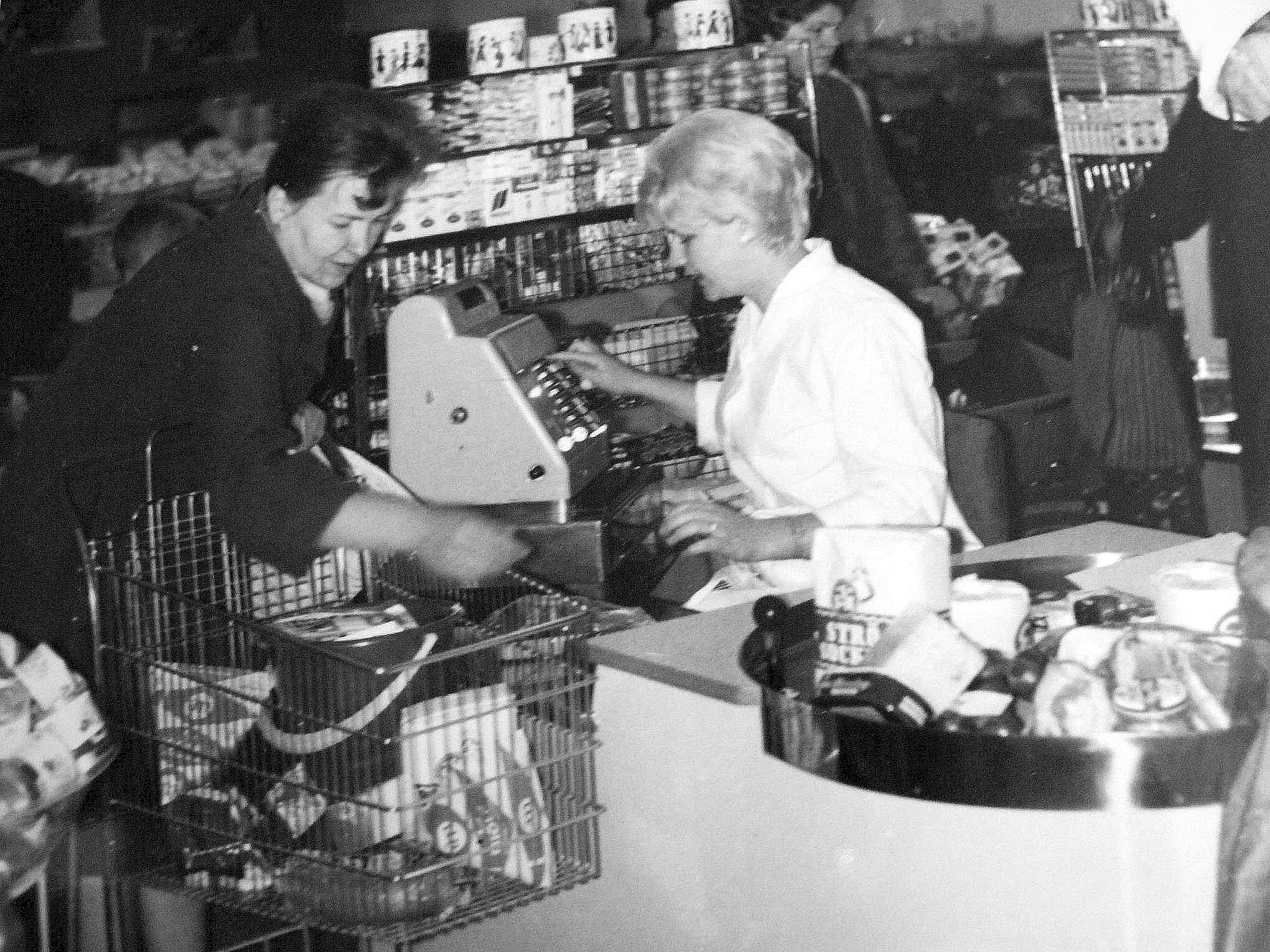 Fotoalbumet Junsele 1964 Invigningen av nya Konsum i Krånge Foto från Konsum. Bildkälla: Bitte Sjöberg. Fr. v. Ellen, kassörska Inga-Helen Lundin (Sehlin). Hans O Alfredsson Konsumhallen invigdes i juni 1964, troligen den 6, dvs samma dag som alla övriga sex konsumbutiker i Junsele slogs igen.