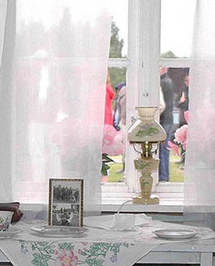 Utsikt inifrån kammaren i bryggstugan mot gårdsplanen.