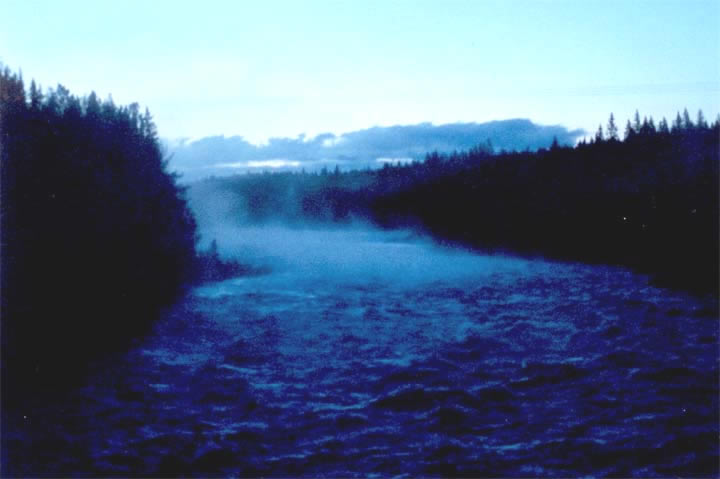 Edensforsen halvtvå söndagmorgon 22 juli 2001. Vi är på väg hem från Jerrys konsert. Det är vattenpåsläpp i forsen, för att lätta på trycket i vattenmagasinen ovanom Junsele, denna regniga sommar. Annars brukar älven vara torrlagd här sommartid. Soluppgången börjar anas med ett trollskt sommarnattsljus, men vi ska hem och sova!