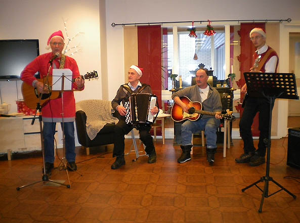 Bild från julaftonen 2010 med Gösta Marcusson och Hans-Olov Bergman, som redan 1962 började med dessa julspelningar på Gunillagården. Medverkande är Nils-Arne Nilsson på gitarr och Nicklas Bohman bas. Foto: Doris Bergman.