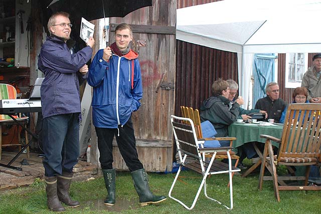 Erik Hellström visar farmors bok som han just läst högt ur. Bistånd med regnskydd av brodern Arvid. Vädergudarna var på grinigt humör denna dag, men trots det var det kö till Bysjö på vägen långt innan caféet öppnade!