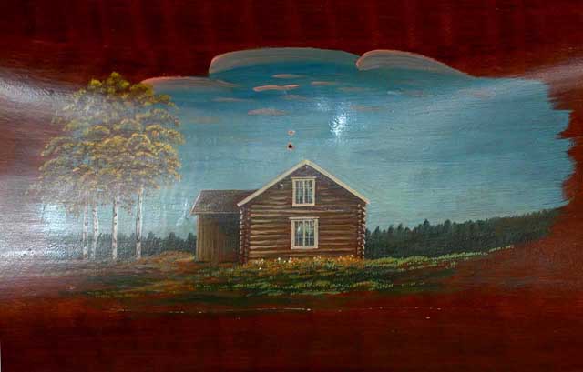 I caféstugan var det dessutom två andra utställningar förutom textilutställningen uppe i häbret. I bottenvåningen visades målade mjölktråg. Här ett tråg med motiv från Lappåsen i Bysjö, där sjön kan anas till vänster. Stugan står fortfarande kvar men skogen har växt upp tätt nu. Vad användes igentligen ett mjölktråg till ursprungligen? "I norra Sverige lät man mjölken stå i mjölktråg av trä några dagar på ett svalt ställe. Därefter hällde man mjölken i ett annat kärl, medan man med handen eller något föremål höll för så att grädden blev kvar". Källa: domboksforskning.se. Med andra ord var mjölktråget en föregångare till separatorn. Troligen gjorde Gustaf de Lavals mekaniska handvevade maskin trågen omoderna långt före 1930-talet och de hade nog legat och samlat damm länge innan trågmålarna gjorde entré i bygden. "Separatorn kom att användas av de flesta mindre lantbruksgårdar i början av 1900-talet". Källa Wikipedia. Inuti dessa gamla och tydligen vid denna tid onödiga köksredskap, lät man på 1930- och 1940-talet kringvandrande målare föreviga sin stuga här i Västra.