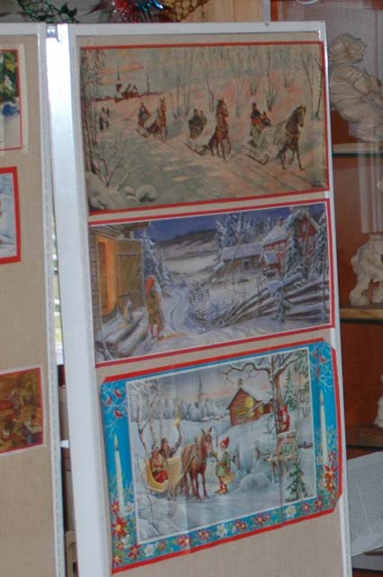 Kent Ingelsson visade på övervåningen (förutom att underhålla med musik i serveringen) en utställning med julbonader och prydnader. Här överst ett originaltryck av Jenny Nyström (1854.06.13-1946.01.17) och under ett nytryck av sonen Curt. Nytrycken håller inte samma kvalitet som originalen i färgåtergivning och papperkvalitet kunde vi konstatera.