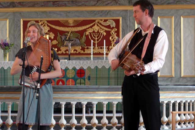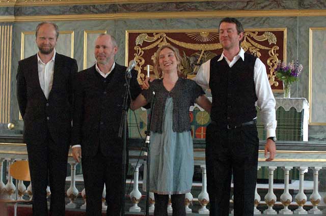 Alla Ulrikas musikanter uppställda. Fr. v. Janne Strömstedt på tramporgel (en orgel i behändigt portabelt format dock), på akustisk gitarr och bas Martin von Schmalensee samt till höger om Ulrika, Niklas Roswall på nyckelharpor. Janne berättade hur psalmtexten "Blott en dag" kom till; Lina Sandell som tydligen var en stressad kvinna med många järn i elden, fick en dag uppmaningen av en väninna att ta livet med lite med ro - en dag och ett ögonblick i sänder. Då gick hon hem och skrev psalmen, inspirerad av uppmaningen. Extranummret blev den vackra och högtidliga "Ljuvli ä jorla".